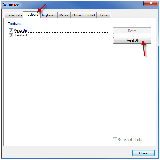 Go to the Toolbars tab and click on “Reset All” > Close :