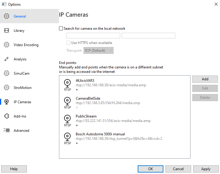 IP Cameras can be configured under Tools → Options → IP Cameras