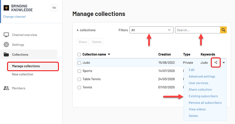 The Manage collections page is the central place to maintain the collection structure of a channel, control access to collection content, and keep collections organized over time. It is used to find existing collections, update their settings, manage sharing and subscribers, and apply actions efficiently when several collections need to be handled at once.
