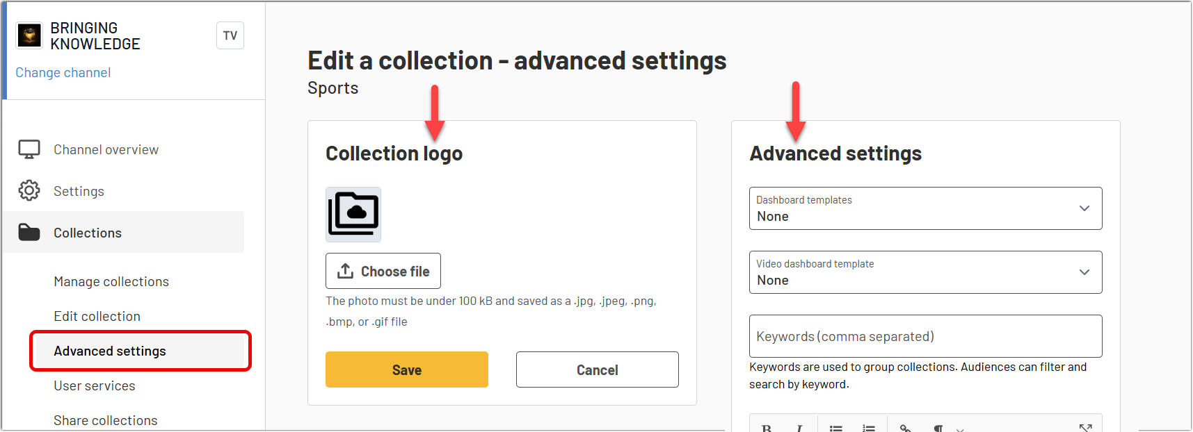 Use Advanced settings to improve how a collection is identified and how it is used in the channel.