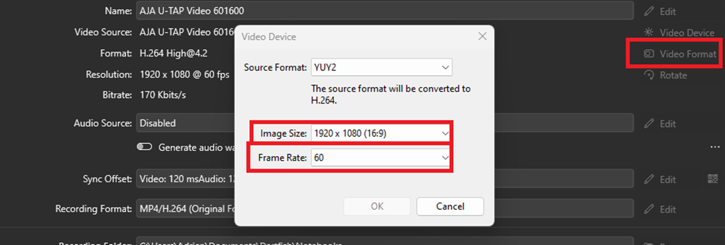 - Réglez la sortie audio sur AJA U-TAP (sinon, aucun son ne sera enregistré)