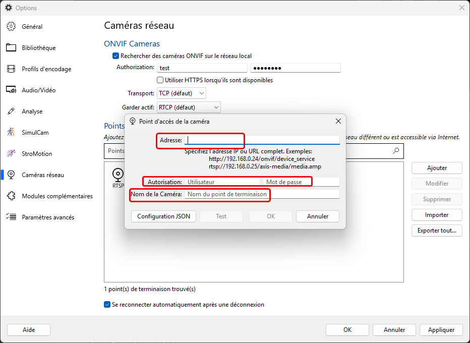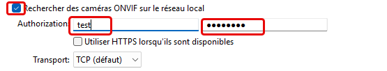 - Saisir les identifiants de l’utilisateur ONVIF
