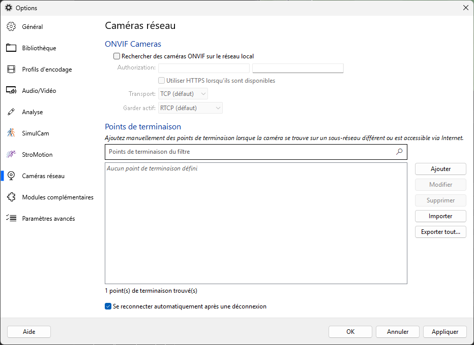- ONVIF (Détection automatique des caméras)