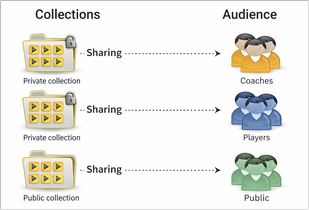 Dans dartfish.tv, une collection n’est pas seulement un moyen de regrouper du contenu. C’est aussi le principal moyen de contrôler qui peut accéder à ce contenu. Au lieu de gérer l’accès vidéo par vidéo, vous définissez une structure de collections, choisissez le type d’accès approprié pour chaque collection, puis placez le contenu au bon endroit.