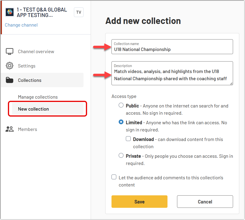 Collections privées : utilisez une collection privée lorsque le contenu doit être disponible uniquement pour des personnes sélectionnées. L’accès est accordé par un administrateur, ce qui en fait le bon modèle pour du contenu interne ou destiné à un public spécifique, comme du contenu réservé aux entraîneurs ou aux joueurs.