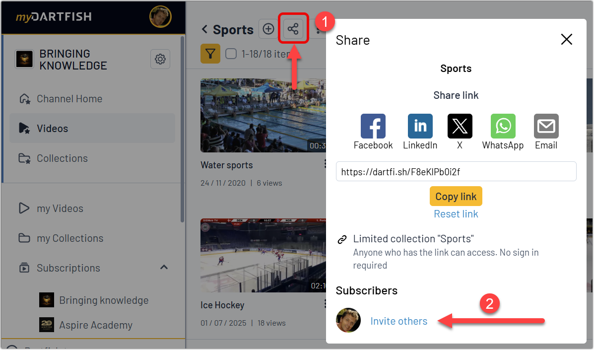 Les collections peuvent aussi être partagées directement depuis le front-end de dartfish.tv.
